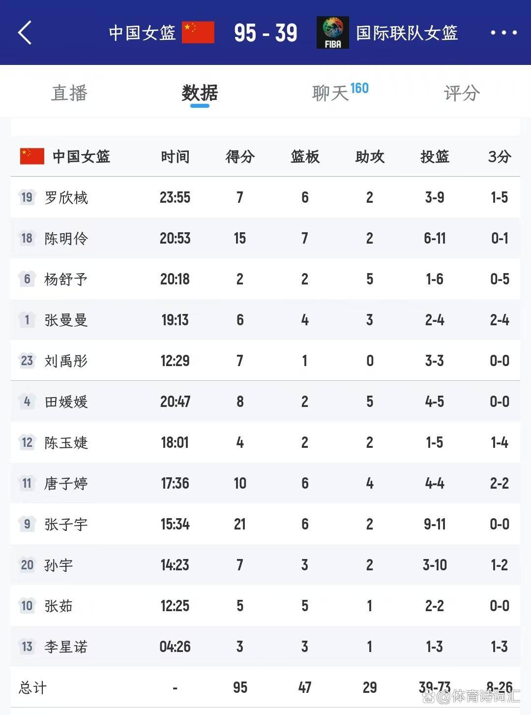 回顾整场比赛,中国女篮火力全开,最终以95比39的大比分战胜对手。值得一提的是,中国女篮共有12名球员得分,充分展现了团队篮球的强大实力。其中,内线核心张子宇表现抢眼,独揽21分和6个篮板,陈明伶也不甘示弱,贡献15分和7个篮板。此外,唐子婷也有10分和6个篮板入账。其他球员虽然得分不多,但都积极参与,为球队的胜利贡献了自己的力量。全队外线手感略显冰凉,26次出手仅命中8球,罚球线上15罚9中,全队出现了14次失误。